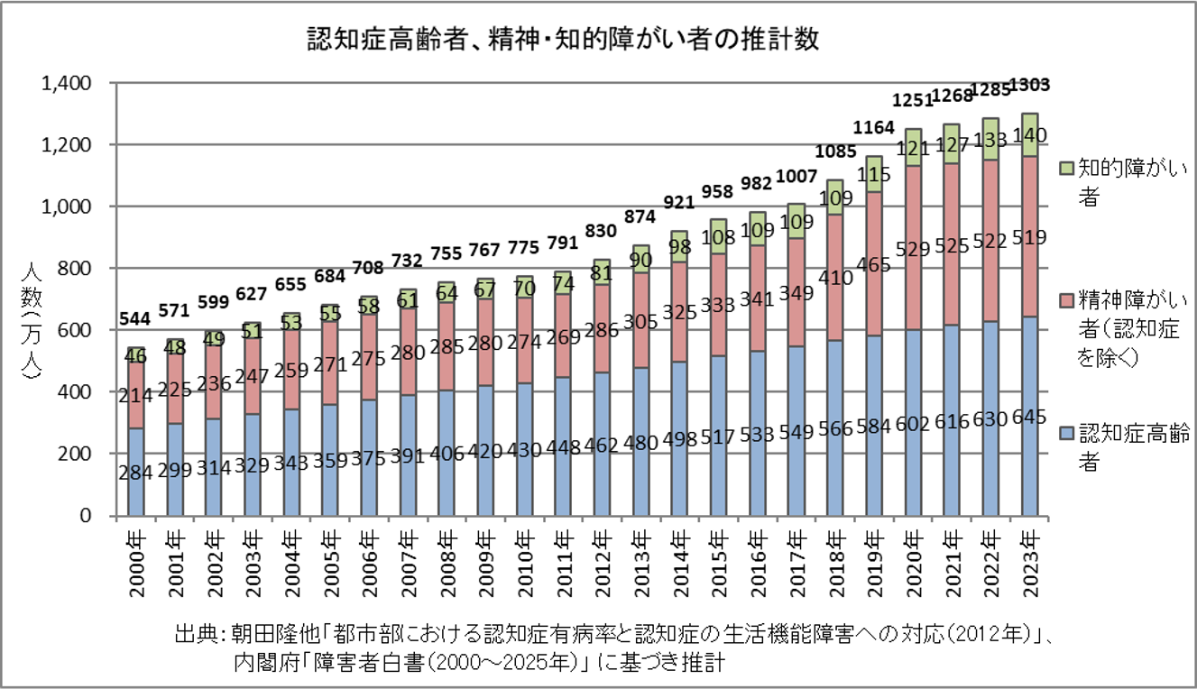 さらに、判断能力が不十分な人は認知症高齢者だけに限りません。精神障がい者(認知症の人を除く)が約520万人、知的障がい者が約140万人ほどいるとみられています。