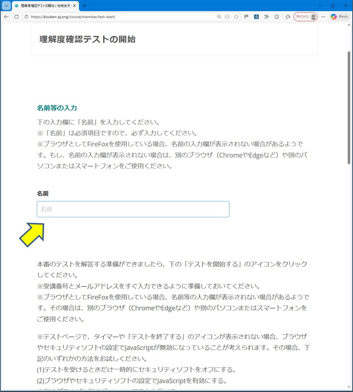 「テストの開始」のページに移動したら、まず始めに、「名前」を入力してください。
